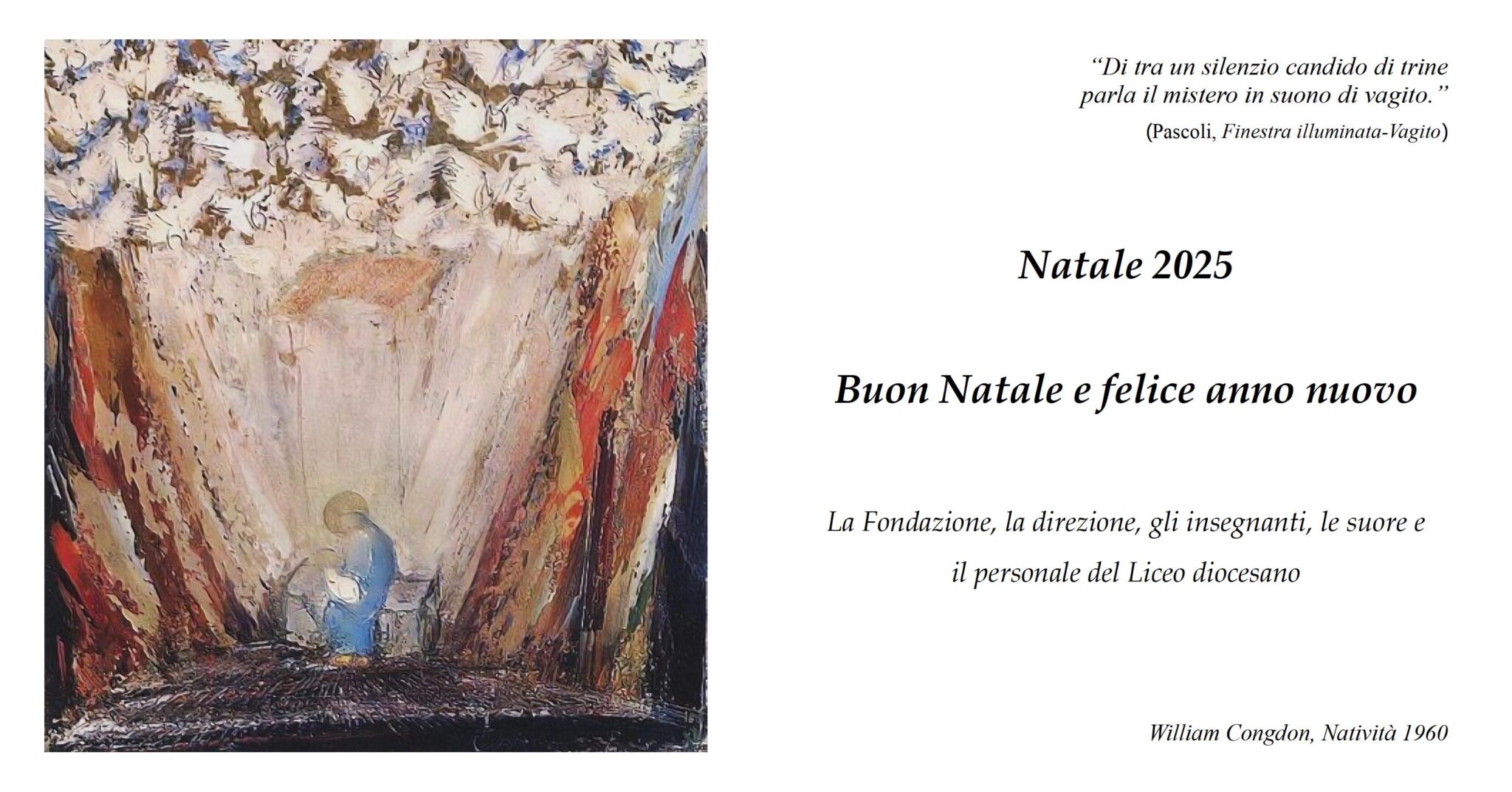 Martedì 23 dicembre tutti i nostri allievi avranno l’opportunità di un momento di riflessione sul Natale a partire dall’opera del pittore William Congdon, pittore che ispira anche i nostri auguri per le prossime festività.